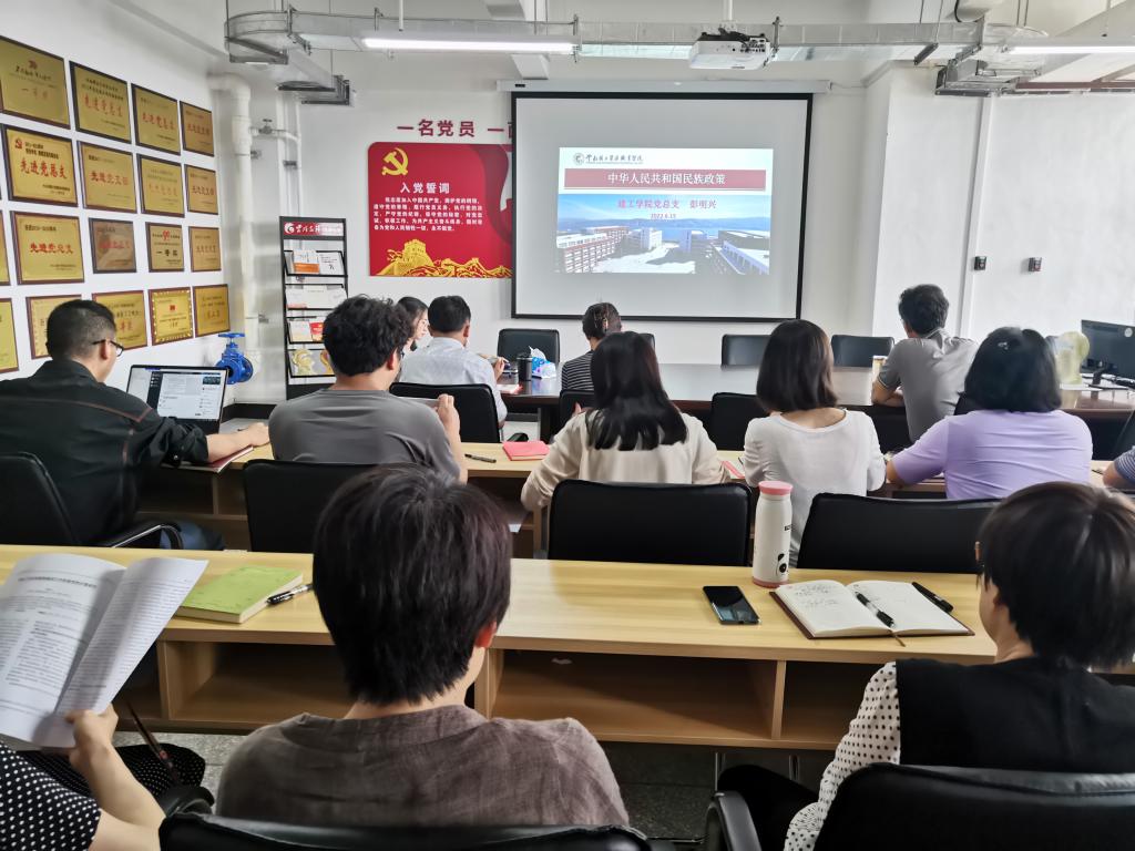 为学习宣传党的民族理论与民族政策,全面推进民族团结进步事业,2022年6月22日下午,beat365官方网站在明尚楼C301会议室学习“中华人民共和国民族政策”专题党课。党课由beat365官方网站院长彭明兴主讲,全院教师参加党课学习。