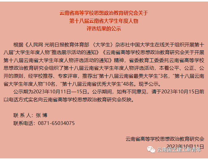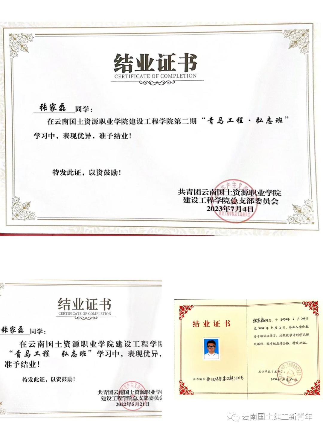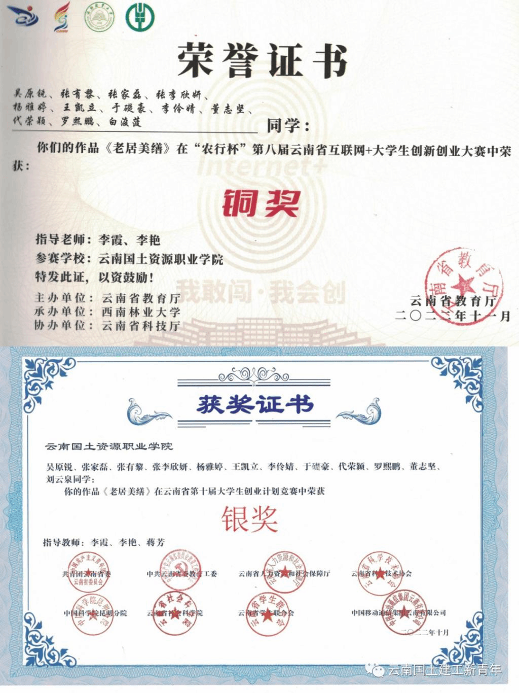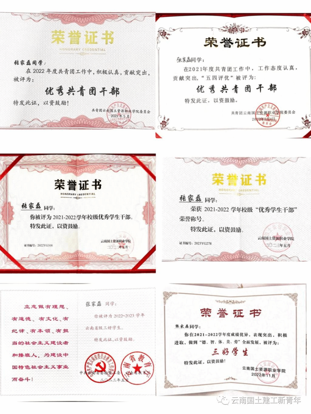 他敢于挑战,勇于实践、不断突破自我。在校期间德智体美劳全面发展,积极参与省级、校级、院级、组织的各类比赛和实践活动并获奖,在校期间获国家级、省级、市级、校级、院级荣誉累计50项。参与云南省第十届“挑战杯”动感地带大学生创业计划竞赛获省级银奖、获云南省第八届“互联网+”创业大赛省级铜奖、参与昆明市阳宗风景名胜区“喜迎二十大,奋进新征程”诵读活动获优秀奖、获“宏志助航计划”高校毕业生就业能力集中培训“优秀学员”、获2022年“大美国土记录”年度人物、参与2022年学校第二届科技创新与制作大赛中分别获“二等奖”、三等奖,在2021级大学生军事训练中被评为“优秀学员”、2021年云南省“铭鼎杯”大学生未来组简历设计大赛获校级三等奖等。