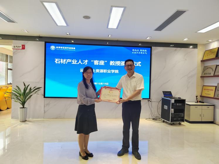 展会期间,在云浮石材协会二楼会议室还举办了我校客座教授聘任仪式,聘任云浮石材协会会长陈思扬、云浮石材协会秘书长王银辉为学校建筑材料工程技术专业客座教授。学校教务处副处长刘应波为陈思扬、王银辉颁发聘书。全国工商联石材业协会党支部原书记林辉、云浮市工艺美术大师覃军、香港石材协会会长陈家健、部分香港企业负责人、云浮石材协会会员单位负责人等参加仪式。
