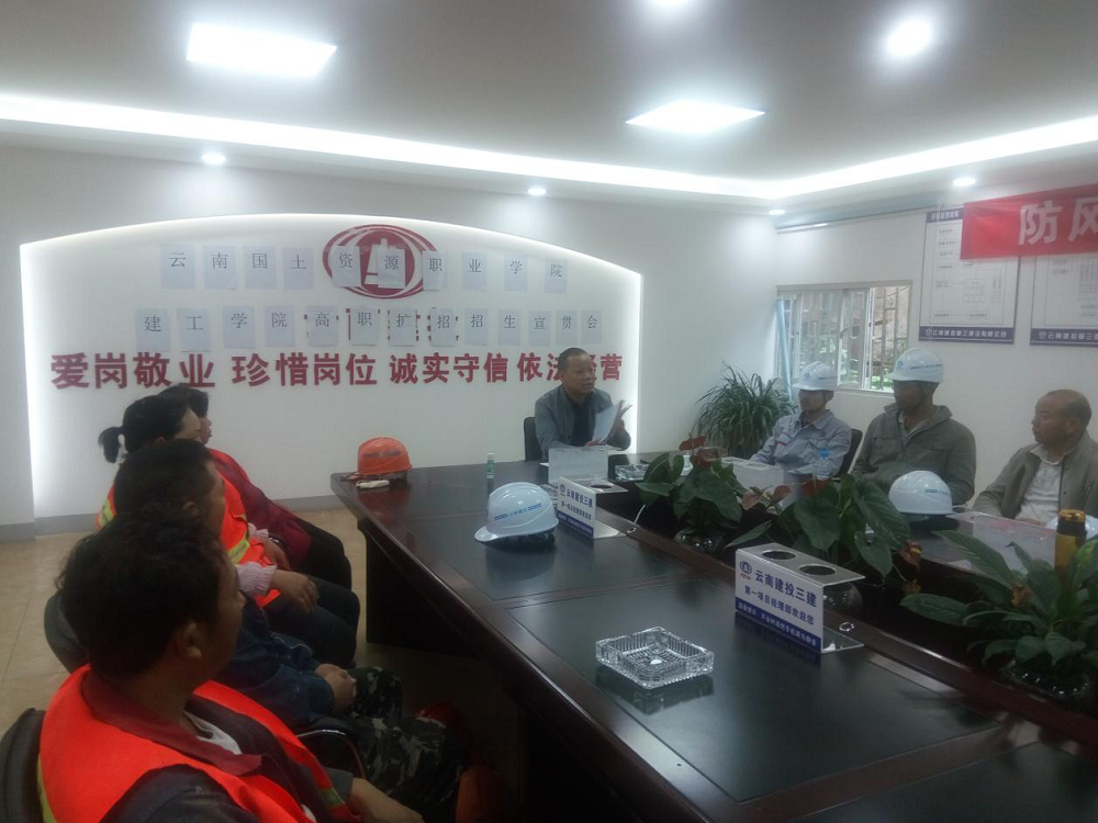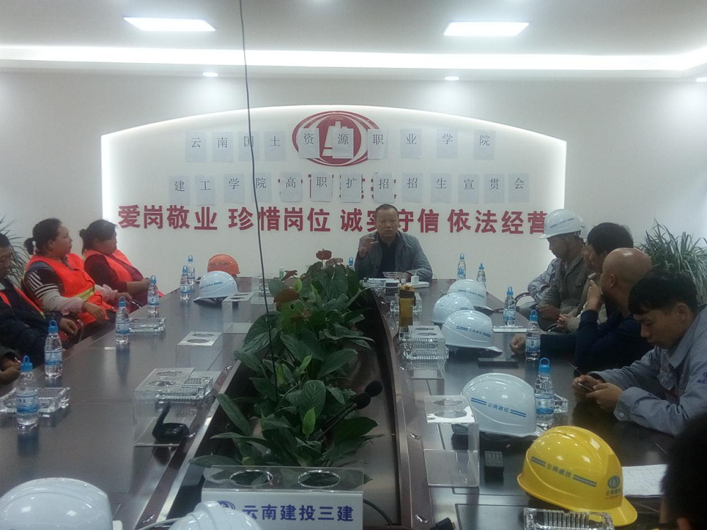 9月12日上午9点,国土beat365官方网站与云南建投第三建设有限公司第一项目经理部在工程部会议室召开“高职扩招招生宣传会”。云南省建投第三建设有限公司项目部王经理,beat365官方网站beat365官方网站院长彭明兴、建筑经济管理教研室朱磊老师出席,20名企业工人代表共同参会。会议由项目部王经理主持。